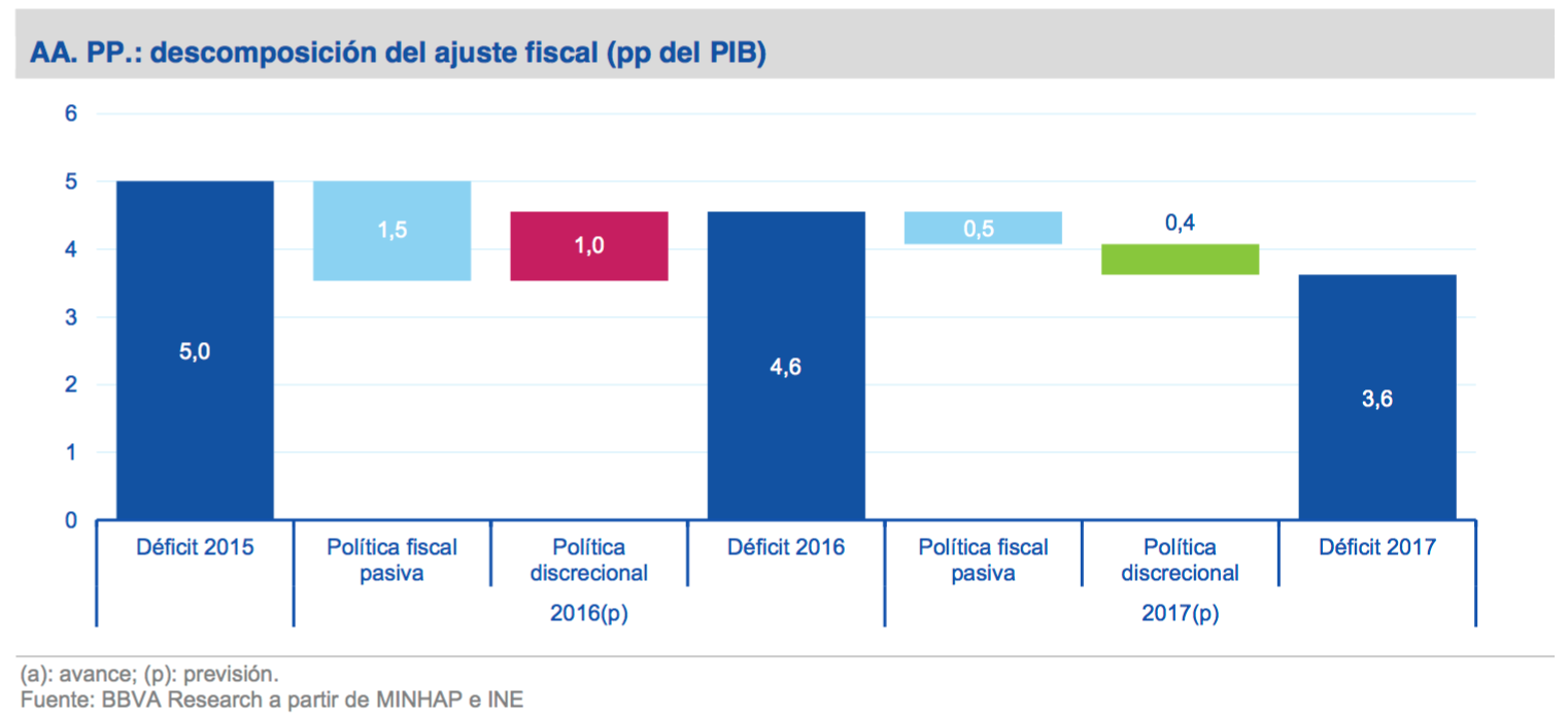 Por tanto, desde BBVA Research no dudan en afirmar que será necesario un ajuste adicional, en el entorno de los 5.000 millones de euros o 0,5 puntos del PIB. De lo contrario, cumplir en 2017 el objetivo de déficit pactado con Bruselas se antoja muy complicado, lo que podría generar nuevas tensiones entre el gobierno de España y las instituciones comunitarias.