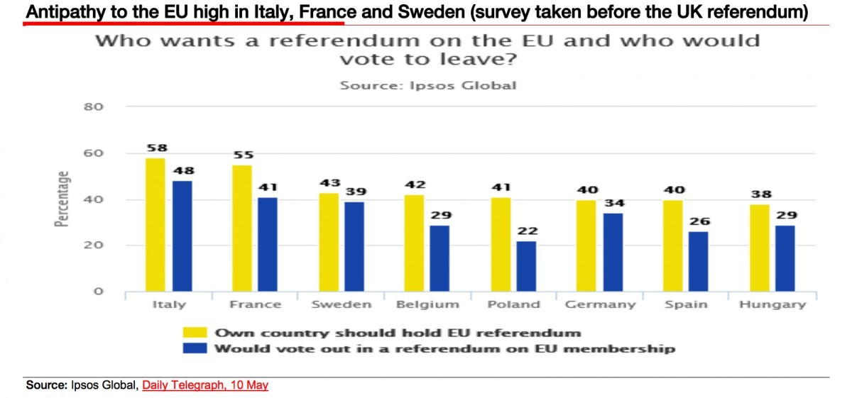 Y es que, esta cita con las urnas se ha convertido en una especie de voto de confianza a la figura de Renzi y su Gobierno. Las encuestas avanzan que los opositores encabezados por el Movimiento 5 Estrellas se aproximan a Renzi y podrían acabar derrotándole, lo cual podría desembocar en un nuevo adelanto electoral a principios de 2017. El problema de fondo es que dicho Movimiento, que encabeza las encuestas electorales y controla ayuntamientos tan importantes como el de Roma y Turín, se trata de un partido de corte populista que cuestiona abiertamente la pertenencia de Italia al euro, abriendo así la puerta a la temida ruptura monetaria (Italexit).