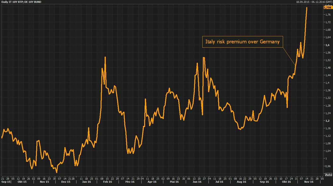 En este sentido, la próxima batalla política se juega en Europa y, más concretamente, en Italia. Los inversores centran ahora su atención en el Movimiento 5 Estrellas, segunda fuerza política del país, y el referéndum sobre la reforma constitucional que se celebrará el próximo 4 de diciembre. El primer ministro del país, Matteo Renzi, se ha jugado buena parte de su futuro político al resultado del plebiscito, de forma similar a lo que ocurrió en su día con el británico David Cameron.