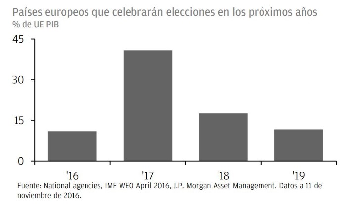 Tras la victoria de Trump en EEUU, el foco político se centra ahora en Europa. Tal y como muestra el siguiente gráfico de J.P. Morgan, los países que representan el 41% del PIB europeo tienen elecciones en los próximos 12 meses y este número no incluye eventos políticos como el comienzo de las negociaciones de la salida de Reino Unido, el referéndum italiano en diciembre y las negociaciones de Suiza con la Unión Europea.