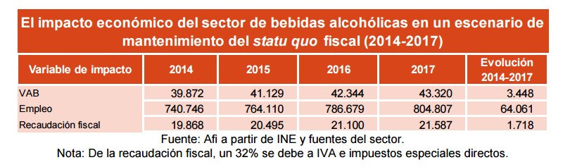 A cierre de 2014, el sector de las bebidas alcohólicas aportó a la economía española un valor añadido de 39.872 millones de euros, lo que supone el 4% del PIB, contribuyó con 740.746 empleos, que representaron al 4,3% de los ocupados de ese mismo año, y aportó 19.868 millones de euros en impuestos. "Estos datos ponen de manifiesto la elevada intensidad en mano de obra del sector, así como su notable capacidad recaudatoria", reza el texto. Por ejemplo, las bebidas con contenido alcohólico suponen un tercio de la facturación de la Hostelería y Restauración.