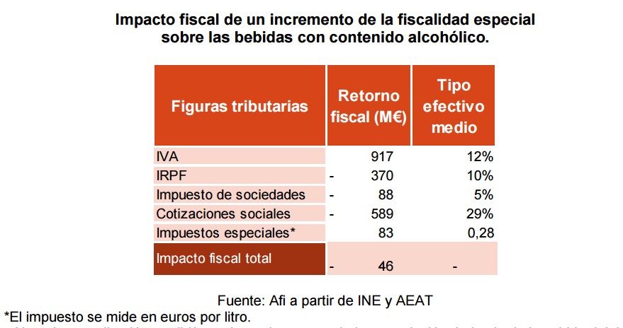 En cuanto al retorno fiscal, observan que el efecto de la recaudación sería el contrario al deseado por el Gobierno. "El aumento de la recaudación por impuestos especiales e IVA de a las bebidas con contenido alcohólico se vería contrarrestada por la pérdida de contribución fiscal asociada a la caída general de la actividad en el resto de figuras tributarias (IRPF, IVA, Impuesto de Sociedades y Cotizaciones Sociales). El resultado sería, paradójicamente, una pérdida neta de 46 millones de euros para las arcas públicas en el año de aplicación de los nuevos tipos fiscales", reza el texto.