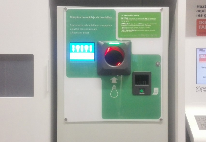 En este sentido, dentro de su nuevo plan, Ikea pretende potenciar el reciclaje con la instalación de máquinas de recogida bonificada de bombillas. Así, una vez el cliente deposite la bombilla usada, que no tiene que haber sido comprada en Ikea, en el aparato podrá elegir entre obtener un descuento de 10 céntimos por unidad para su próxima compra en bombillas LED de Ikea o donar esa gratificación a un proyecto solidario. Las entidades adscritas son: ACCEM (mujeres solas refugiadas con menores a su cargo), CEAR (familias refugiadas con menores) y Save The Children (niños y niñas en riesgo de pobreza en Pan Bendito de Madrid).