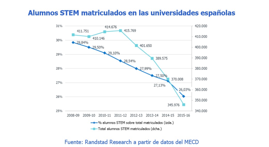 El dato es todavía más preocupante si se tiene en cuenta que los estudiantes STEM están disminuyendo en España. En los últimos siete años, el número de alumnos matriculados en este tipo de carreras ha descendido, en términos absolutos, en más de 65.000 profesionales. Además, en términos relativos, han pasado de representar el 30% del total de estudiantes en 2009 al 26% en 2016.
