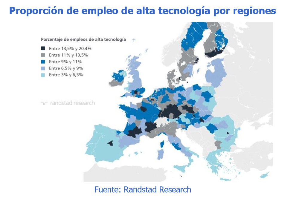 Madrid cuenta con una proporción de empleo de alta tecnología por encima del 13,5%, mientras que País Vasco se sitúa entre el 9% y el 11%. Aragón y Cataluña, por su parte, se sitúan entre el 6,5% y el 9%. El resto del territorio nacional se sitúa por debajo del 6,5%, al nivel de regiones como el sur de Italia, Grecia o algunos países de Europa del Este.