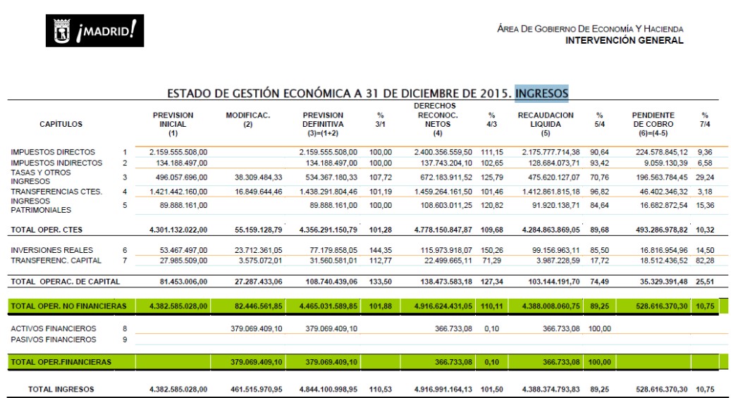 El gobierno anterior del Partido Popular presentó un presupuesto para el ejercicio 2015 donde había unos ingresos iniciales de 4.382 millones de euros, si bien finalmente el 2015 se cerró con unos ingresos de 4.916 millones. En total, 534 más de lo previsto, cifra sin duda extraordinaria. ¿Es mérito de Ahora Madrid recaudar 534 millones más de lo previsto?