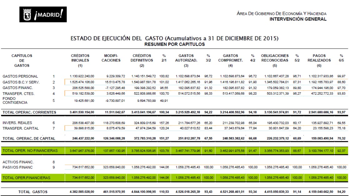 En el cuadro de gastos del ejercicio 2015, podemos ver cómo hay previstas unas inversiones de 324 millones para, al final, ejecutar 195 millones, o unos gastos en bienes y servicios de 1.540 millones de los que sólo ejecuta 1.345 millones. Esto evidentemente redunda en un superávit.