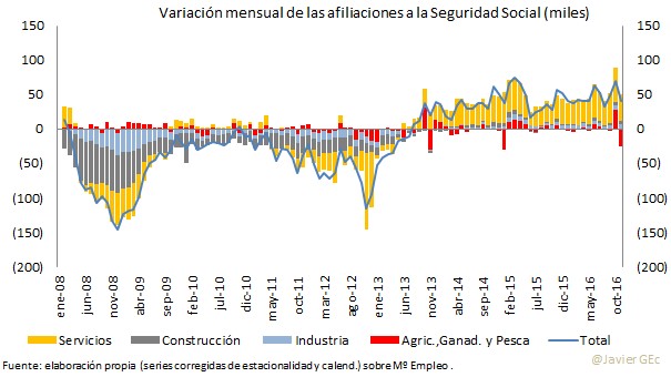 En definitiva, tal como apuntamos en su momento, el crecimiento del empleo en octubre estuvo en parte impulsado por un repunte puntual de las contrataciones en el sector primario y público que no tenía por qué tener continuidad en los siguientes meses.
