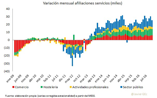 En los servicios también se observa una cierta desaceleración, en este caso debido al empleo vinculado con el sector público, como la sanidad o la educación. En un caso similar al del sector primario, en noviembre se ha corregido el extraordinario crecimiento registrado en octubre.