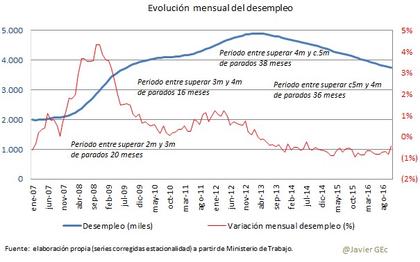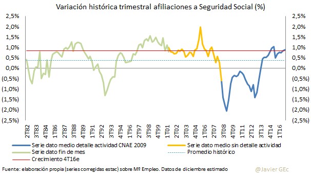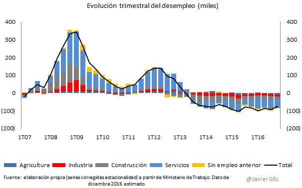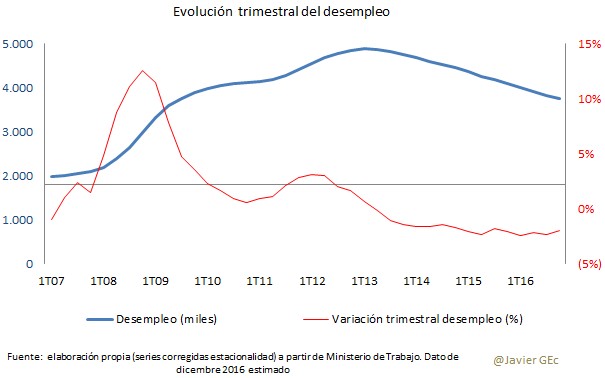 La serie mensual es algo volátil, por lo que conviene ver la serie trimestral. En este caso, y tomando la estimación del mes de diciembre, hay un descenso del 2%, no muy diferente del registrado en el trimestre anterior (-2,3%). Se mantiene, pues, el descenso del paro.