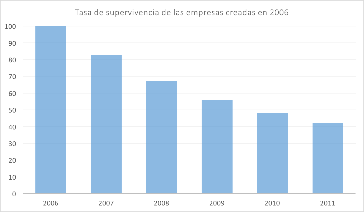 Si echamos la vista atrás, vemos que por cada 100 empresas creadas en 2006, apenas 83 seguían operando un año después, en 2007. Por tanto, 17 de cada 100 sociedades constituidas entonces acabó muriendo en apenas un año. Si avanzamos hasta 2008, vemos que solo 67 de cada 100 empresas creadas en 2006 seguían existiendo, mientras que el 33% había cerrado.