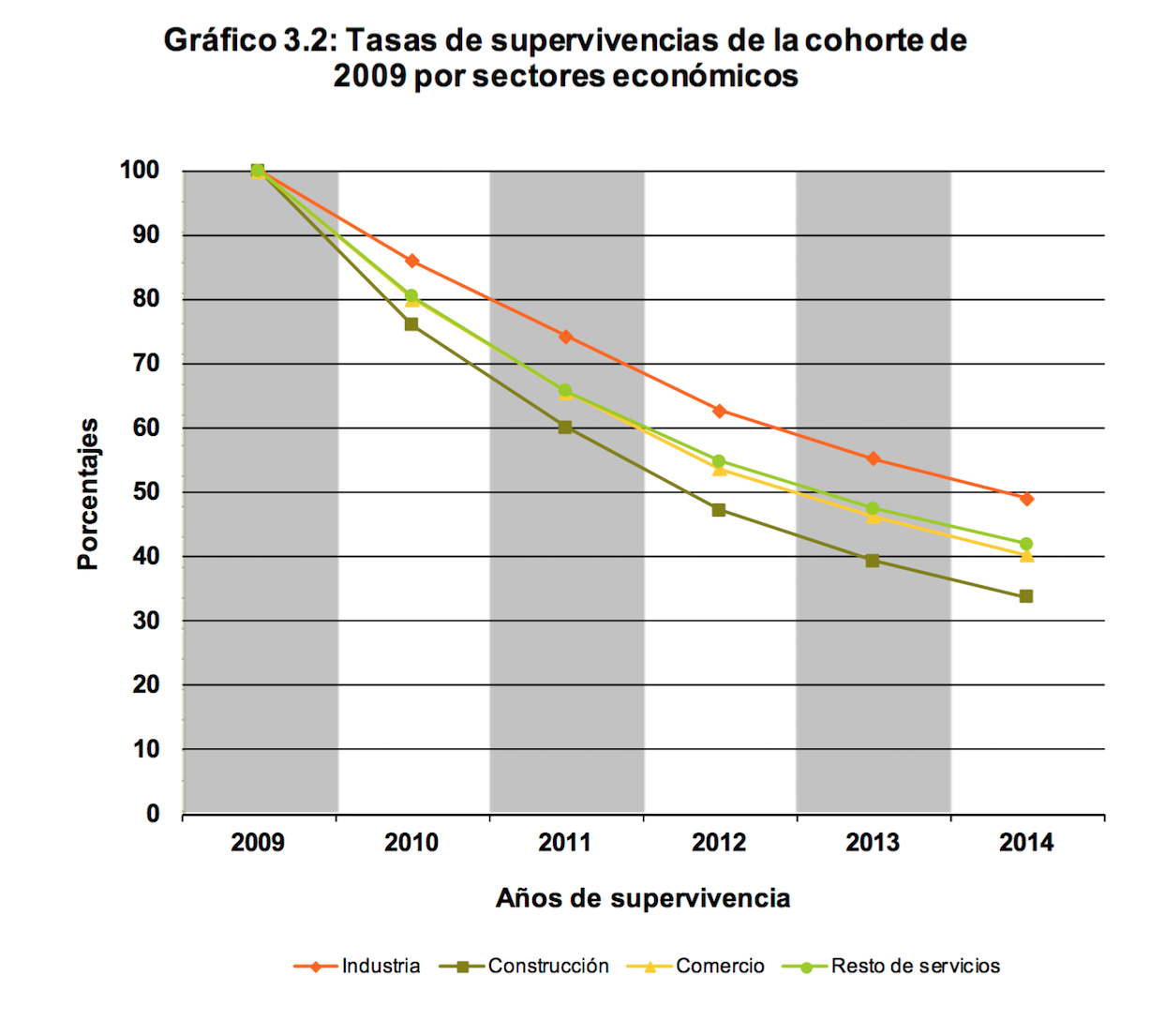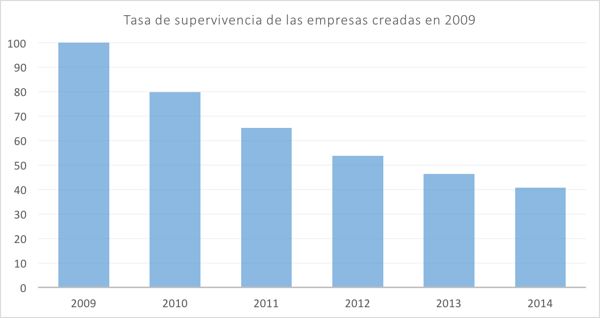 Estos porcentajes no son muy distintos de los que se apuntan las empresas creadas en 2009. Según los datos del Instituto Nacional de Estadística, en 2010 ya había desaparecido el 20% de dichas sociedades, mientras que en 2014 quedaban en pie 41 de cada 100 empresas creadas un lustro atrás.
