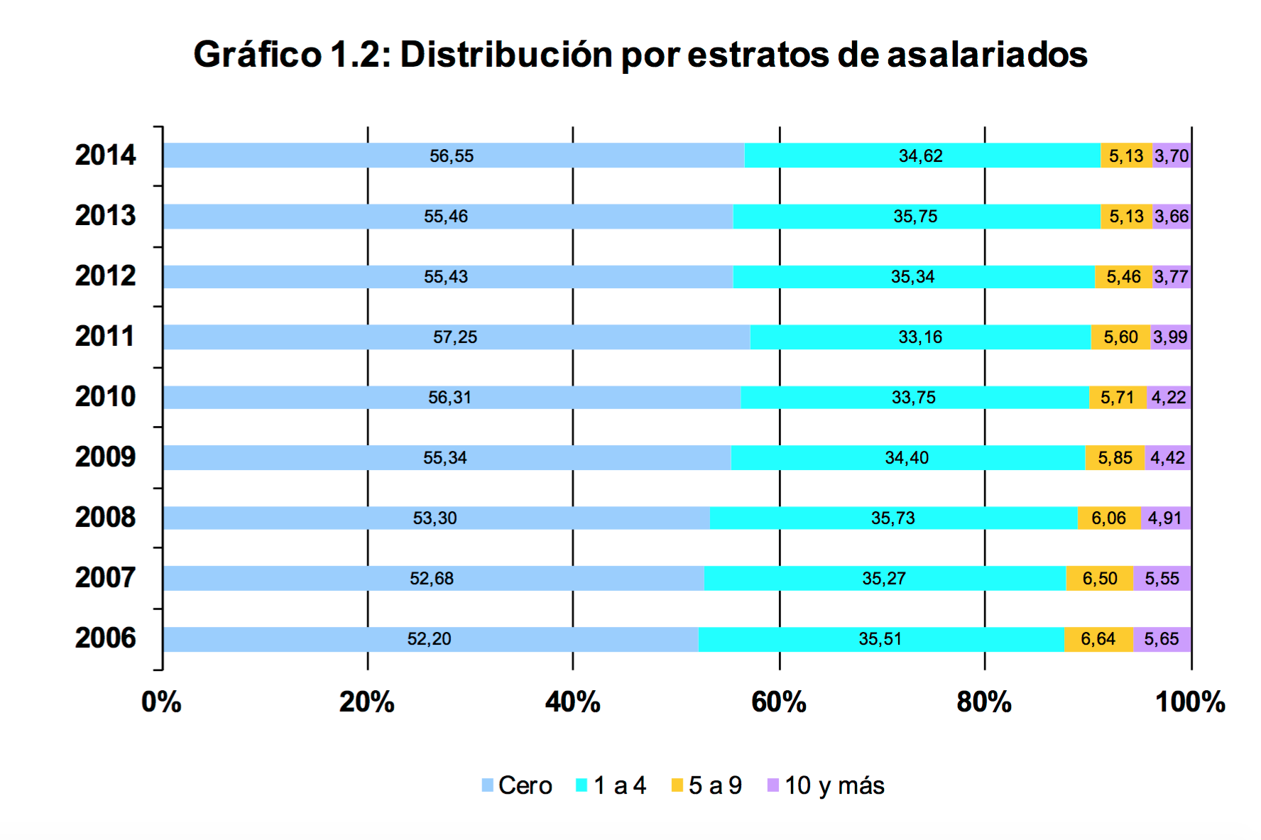 La dificultad para lanzar una empresa y mantenerla a flote también queda reflejada en la distribución por el número de trabajadores. Las sociedades sin empleados son hoy el 56,55% del total, frente al 52,20% de 2006. Sin embargo, el papel de las compañías de entre 5 y 9 empleados es marginal (5,13% en 2014, frente a 6,64% en 2006), mientras que las sociedades con 10 o más ocupados son solo el 3,70% del total (5,65% en 2006).