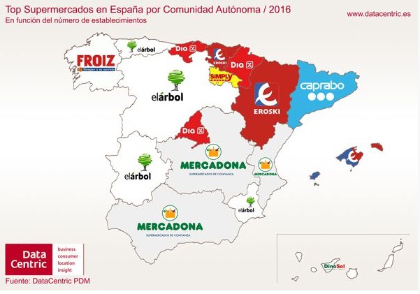 En la categoría de los supermercados las cadenas reinas de cada comunidad son en muchos casos compañías regionales y todas de capital español, salvo Simply (Grupo Auchan) en la Rioja. Para su elaboración, han tomado como referencia el número de establecimientos.