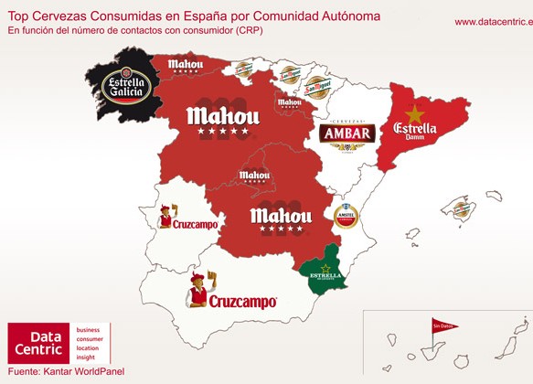 Gallegos, aragoneses o murcianos presumen de su marca local de cerveza, mientras la madrileña Mahou se va abriendo mercado del noroeste al sureste. El ranking de cerveceras está construido en base a la variable CRP o contactos con el consumidor, un indicador que mide cuánta gente y cuántas veces al año se compra la marca en cada hogar