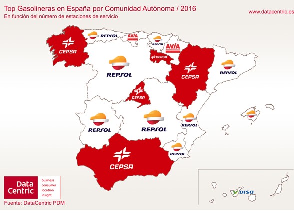 La canaria DISA y la vasca Avia comparten el mapa con los gigantes Cepsa y Grupo Repsol. Las marcas internacionales BP, Shell o Galp se encuentran en casi todas las CCAA, pero siempre a gran distancia de cada líder. Se calcula en función del número de estaciones de servicio.
