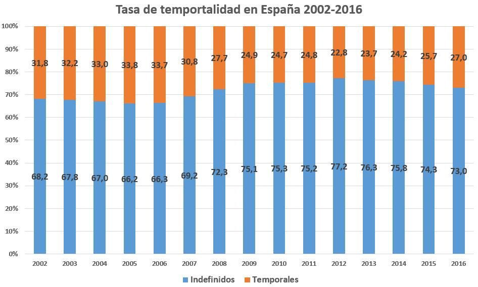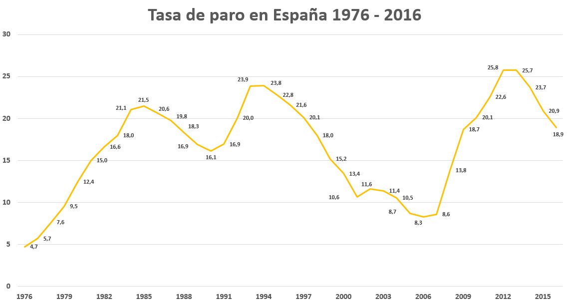 Por ejemplo, en el anterior gráfico puede verse la tasa de paro en España entre 1976 y 2016. Ya nos hemos acostumbrado a cifras por encima del 15-20%, pero no deberíamos. En los países ricos de Europa, tener una tasa de desempleo por encima del 10% se considera un drama y puede derribar gobiernos. En España, la tasa media de paro desde los años 80 se ha mantenido en el 17% y la tasa de paro estructural en el 15%. Sorprende, con estas cifras, que se idealice de esta forma la realidad pre-reforma. Porque además, ésta no ha cambiado de un día para otro el mercado laboral, pero la curva nos indica que marchamos en la buena dirección.