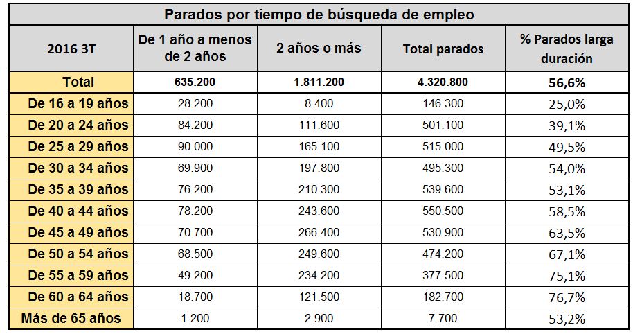 La siguiente tabla muestra claramente la gravedad de la situación y la magnitud del reto. La notable mejoría del mercado laboral en los últimos tres años no termina de llegar a los PLD. Todos los estudios apuntan en la misma dirección: cuanto más tiempo lleva un parado sin trabajo, más complicado le resulta volver a subirse al carro del empleo. Por eso, los expertos aconsejan a los desempleados que no pierdan tiempo e intenten encontrar trabajo cuanto antes. Estar más de 6-8 meses en el paro hunde las opciones de encontrar un nuevo empleo.