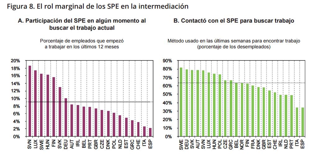 Tan sólo un 2% de las personas que iniciaron su trabajo en 2012 reconoce haber tenido alguna relación con el SPE que ayudara en el proceso de creación de la relación de trabajo. Del mismo modo, menos de uno de cada tres españoles en paro contactó con una oficina del SPE en el mes anterior a la entrevista de trabajo. En ambas puntuaciones, España ocupa la posición más baja entre los países miembros de la OCDE. (…) Sólo uno de cada seis desempleados registrados en enero de 2015 y uno de cada ocho de desempleados de bajo nivel educativo recibieron algún servicio de los SPE durante los tres meses siguientes.