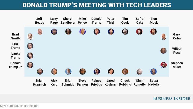 En una enorme mesa rectangular del piso 25 de la Torre Trump de Nueva York se sentaron casi todos los directivos de las empresas más representativas de este mercado: Apple (Tim Cook), Microsoft (Satya Nadella), Google (Larry Page y Eric Schmidt), Intel (Brian Krzanich), IBM (Ginni Rometty), Cisco Systems (Chuck Robbins), Amazon (Jeff Bezos), Facebook (Sheryl Sandberg), Tesla (Elon Musk) y Oracle (Safra Catz), entre otros.