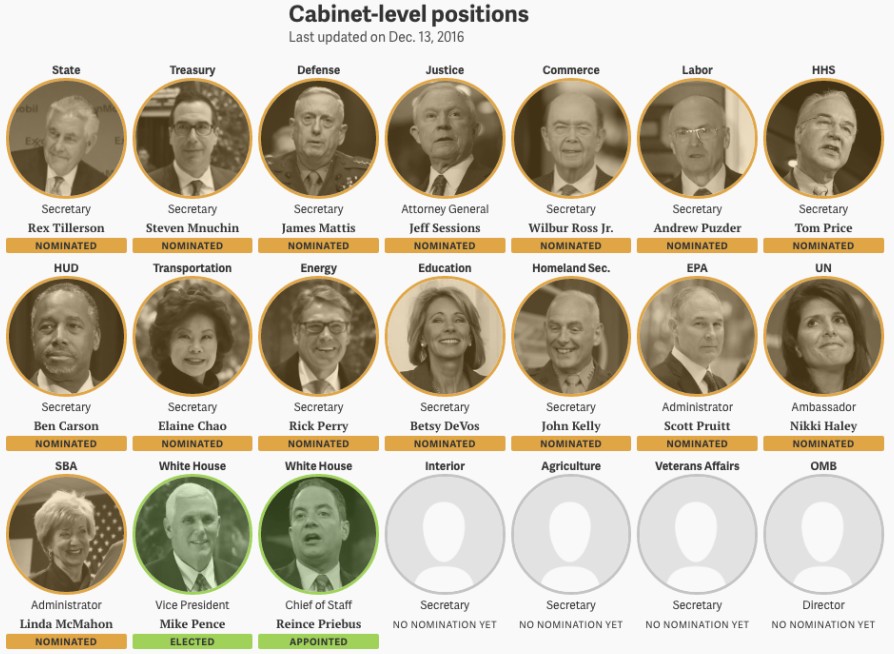 – Andy Puzder, secretario de Trabajo: responsable de la cadena de restaurantes CKE, es contrario a elevar el salario mínimo a nivel federal, una de las medidas estrella de Obama, y favorable a la automatización e implantación de nuevas tecnologías en la estructura productiva.