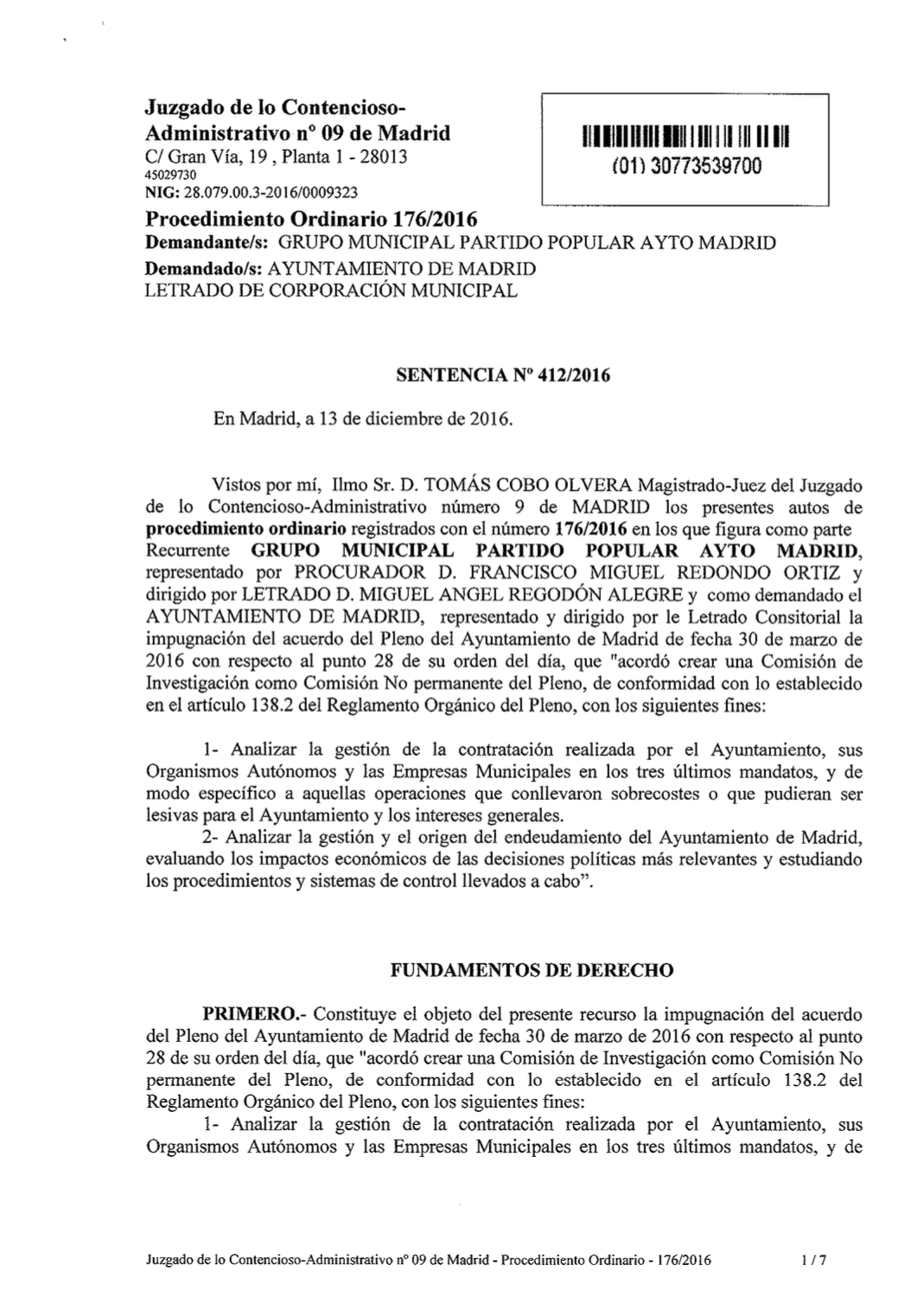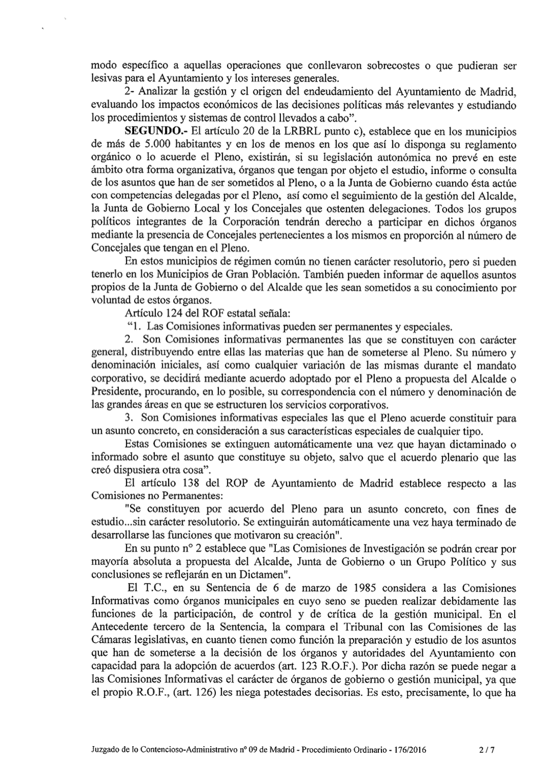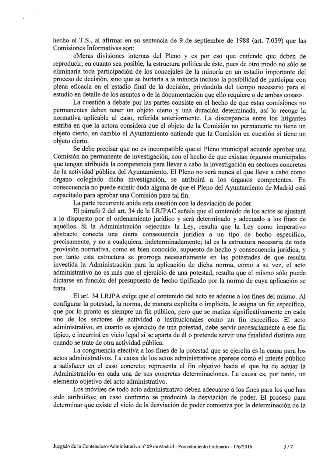 Tras conquistar el poder con los votos del PSOE, Ahora Madrid hizo de esta comisión una de las puntas de lanza de su ofensiva contra el PP.Sin embargo, la sentencia apunta que "la finalidad de la Comisión está planteada de manera genérica, sin concretar el asunto a investigar específico". El juez añade, de hecho, que "del contenido del acuerdo de creación de la Comisión se desprende que no tiene objeto concreto".