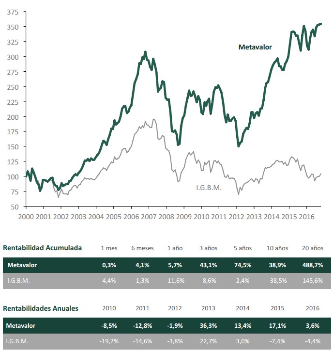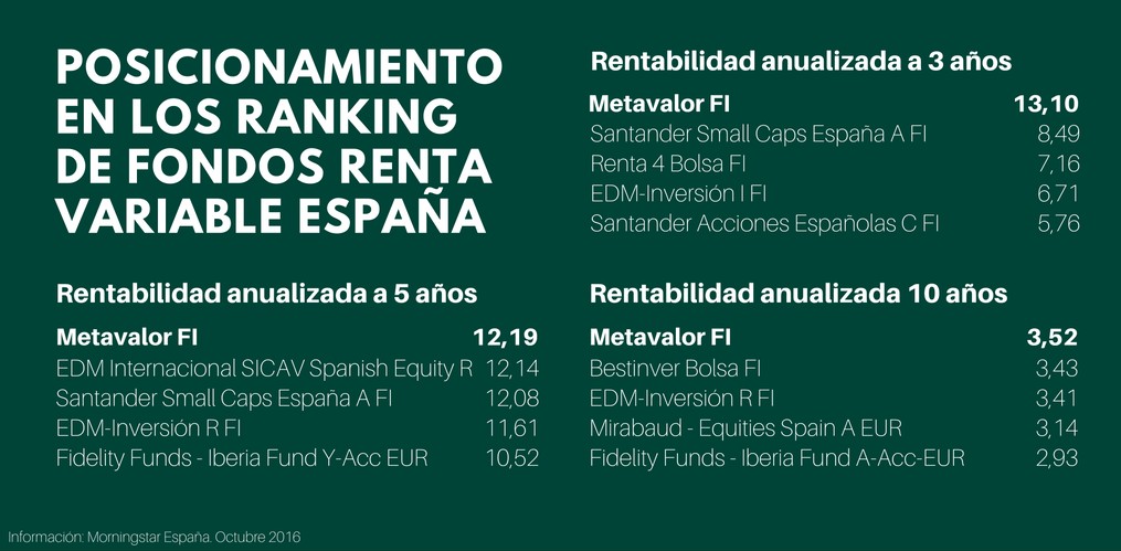 Con un rendimiento del 43% a tres años y del 74,5% a cinco años, Metavalor apuesta por el mercado de renta variable español, aunque también puede invertir en Portugal. Compra acciones que cumplan todos los requisitos de su proceso inversor basado en el Value Investing. Su estilo Value le lleva a apostar por medianas compañías del panorama nacional como Talgo, especializada en la fabricación de trenes, Miguel y Costas, fabricante y distribuidor de papeles especiales o Applus, conocida en nuestro país por su división en las ITVs.