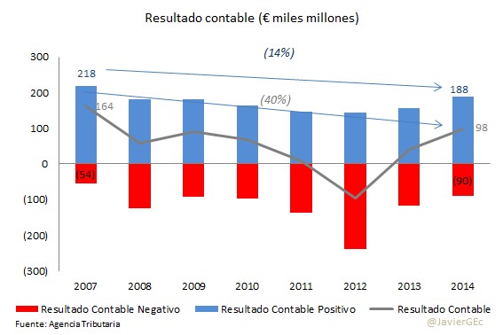 Para un correcto diagnóstico sobre esta materia, debería analizarse la evolución de los resultados empresariales durante la crisis y preguntarse por qué el total de las empresas en pérdidas apenas se reduce. Desde 2007, mientras el resultado total ha descendido un 40%, el de las empresas en beneficios lo ha hecho mucho menos, un 14%.