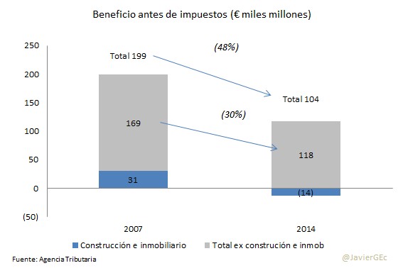 También habría que recordar que entre 2007 y hoy se ha producido el estalllido de la burbuja inmobiliaria. En este periodo, se ha reducido el beneficio antes de impuestos a la mitad, pero bastante menos (-30%) si se excluye de la comparativa al citado sector inmobiliario.