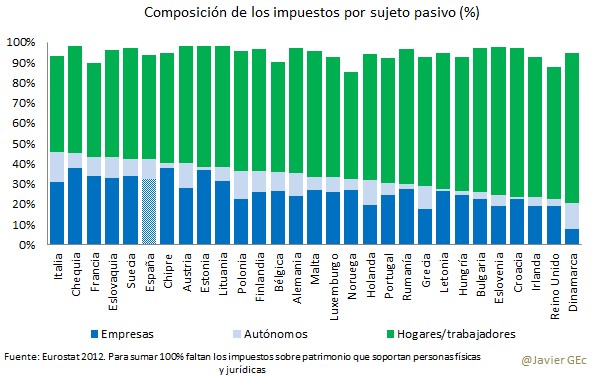 Por último, pero no menos importante, si se combina el efecto de estas medidas con el de la subida de cotizaciones máximas a la Seguridad Social, el resultado es un fuerte endurecimiento de la tributación empresarial que, contrariamente a lo que se pueda pensar, soportan, en términos relativos, una una mayor fiscalidad que las familias en otros países europeos.