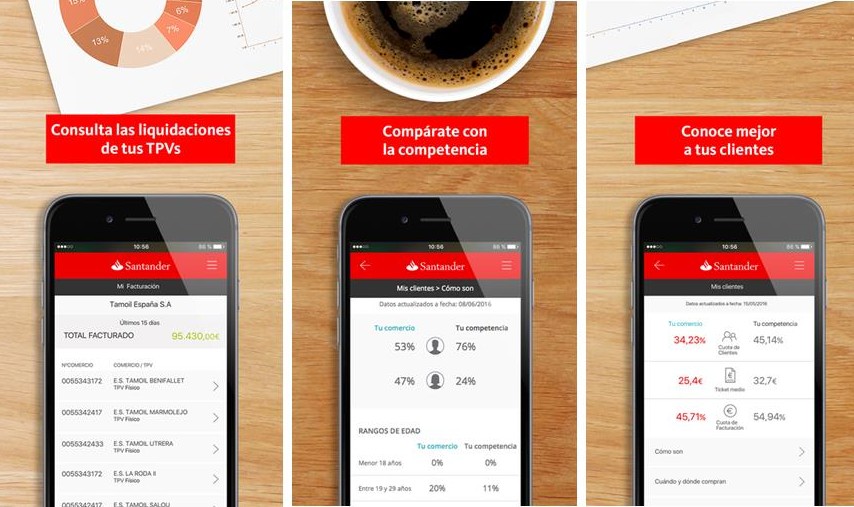 La aplicación, disponible para todas aquellos profesionales que cuenten en su día a día con un TPV de Banco Santander, ofrece gráficos y estadísticas de cada negocio como facturación, transacciones o consumo medio y analiza el comportamiento de los clientes: recurrencia, fidelidad, edad, perfil social o nivel de renta, entre otros .