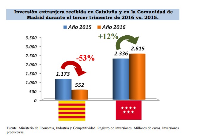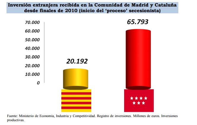 Desde finales de 2010, momento en el cual CiU tomó posesión del gobierno autonómico de Cataluña con mención expresa a una hipotética secesión, los inversores extranjeros empezaron a huir de Cataluña. En la siguiente tabla se muestra la inversión extranjera recibida en ambas regiones desde entonces.