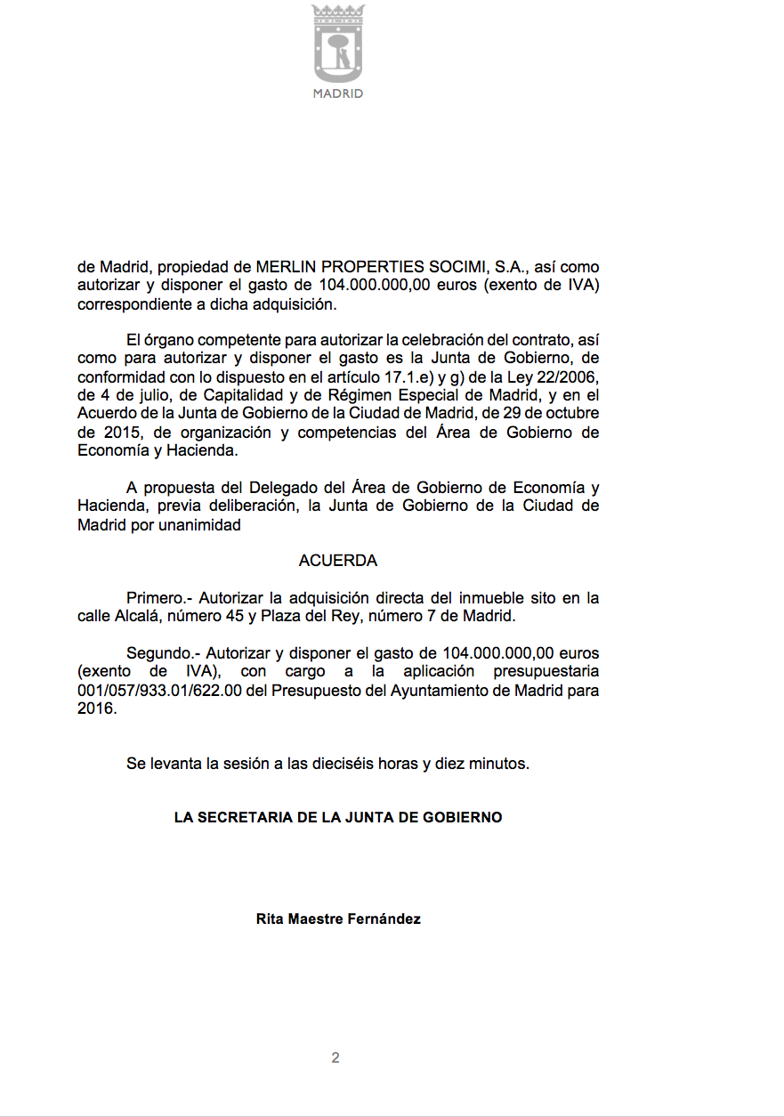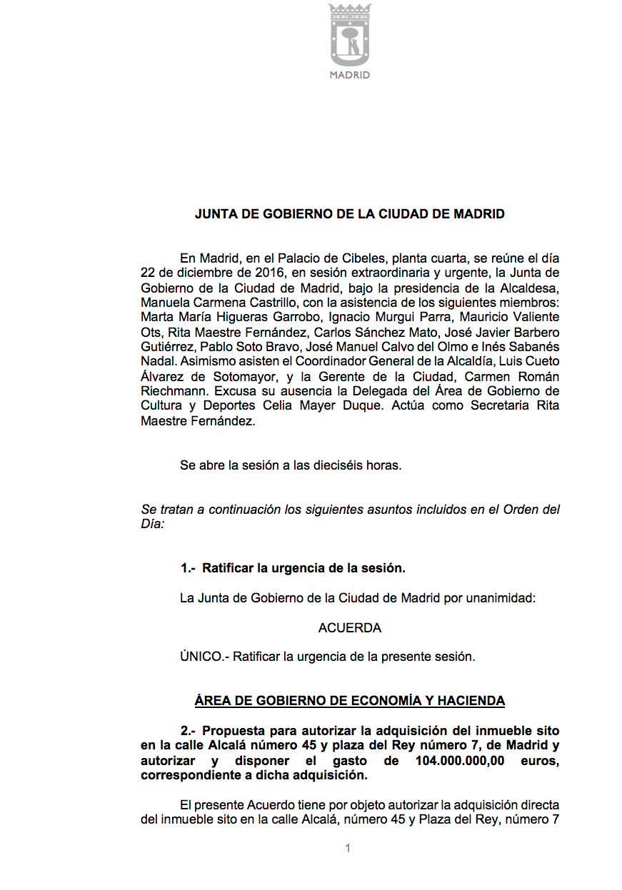 Sánchez Mato tramitó la compra en la Junta de Gobierno del Ayuntamiento de Madrid celebrada el 22 de diciembre de 2016