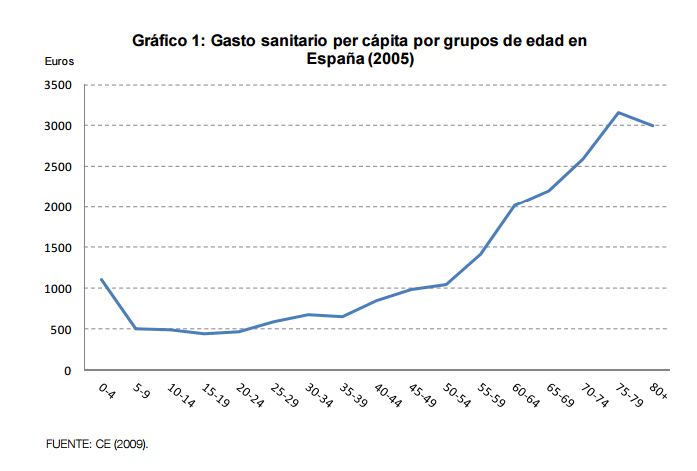 En este punto, hay que recordar que el gasto sanitario tenderá a subir con fuerza en los próximos años con motivo del envejecimiento de la población. Como puede verse en el siguiente gráfico, incluido en un informe del Banco de España sobre gasto sanitario en los países de la OCDE, entre los 20 y los 50 años, el gasto de un adulto medio en servicios sanitarios se mantiene más o menos constante, apenas con una ligera tendencia ascendente. Pero a partir de los 55-60 años empieza a crecer con fuerza. Y según se va envejeciendo, la factura sube todavía más. Algo que es bueno (el aumento de la esperanza de vida) tendrá un coste económico. No tiene sentido cerrar los ojos a esta realidad. España va a ser durante las próximas décadas uno de los países con un porcentaje más elevado de habitantes mayores de 65 años.