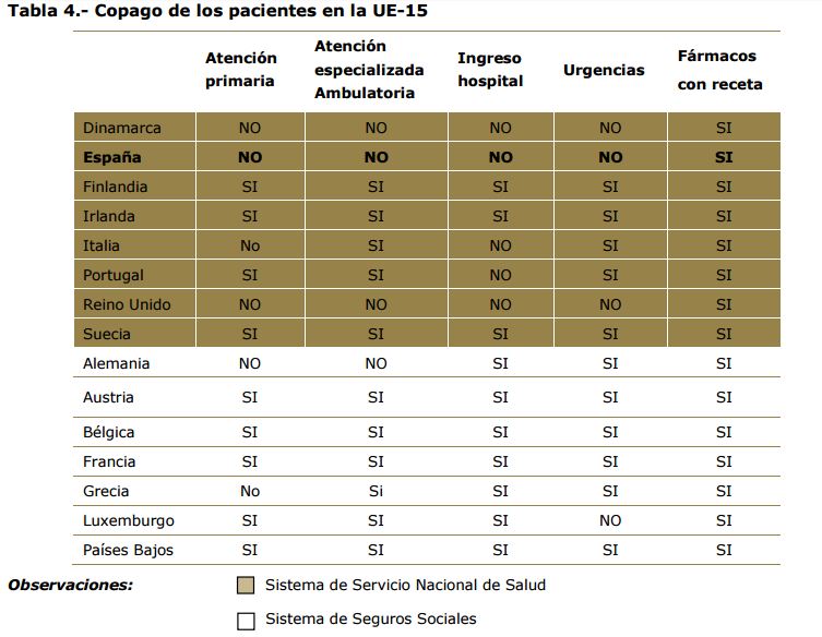 Como puede verse en la siguiente tabla, incluida en el informe Los Sistemas Sanitarios en los Países de la UE, publicado por el Ministerio de Sanidad en 2014, sólo en Dinamarca y Reino Unido (dentro de la UE-15, los países más ricos, que formaban parte de la Unión antes de la ampliación al este) tienen un sistema sanitario tan generoso como el español. En los demás, hay copagos de forma generalizada. Algunos sólo lo tienen establecido para urgencias e ingresos hospitalarios (como Alemania), aunque en la mayoría se cobra una pequeña tasa en todos los niveles del servicio, desde la atención primaria a las urgencias, pasando por las visitas al especialista o las estancias hospitalarias: