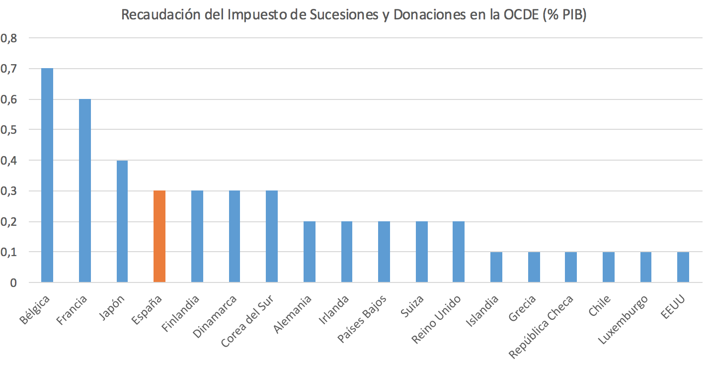 Si comparamos la recaudación con el PIB, encontramos que España es el cuarto país de la OCDE que más impuestos cobra a las herencias y transmisiones de patrimonio. Por delante están Bélgica, Francia y Japón, mientras que a nuestro nivel se sitúan Finlandia, Dinamarca y Corea del Sur. Por debajo de España figuran Alemania, Irlanda, Países Bajos, Suiza, Reino Unido, Islandia, Grecia, República Checa, Chile, Luxemburgo y Estados Unidos.