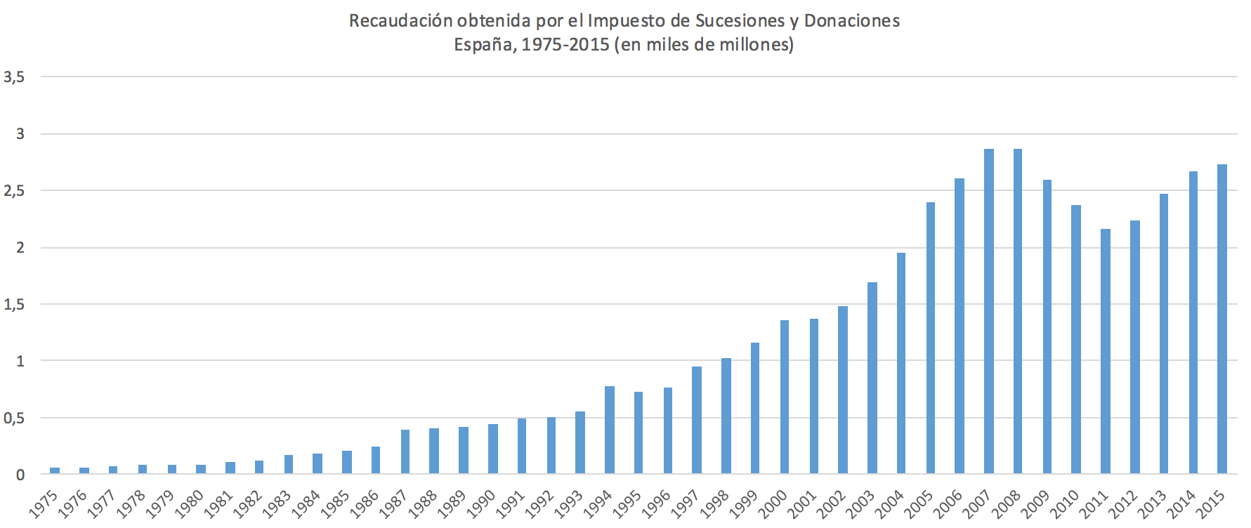 La recaudación obtenida por el Impuesto de Sucesiones y Donaciones subió espectacularmente desde 1975 hasta 2008 y, a pesar de la Gran Recesión, vuelve a situarse en niveles muy elevados. Así se desprende de las tablas de recaudación que España envía cada año a la OCDE.
