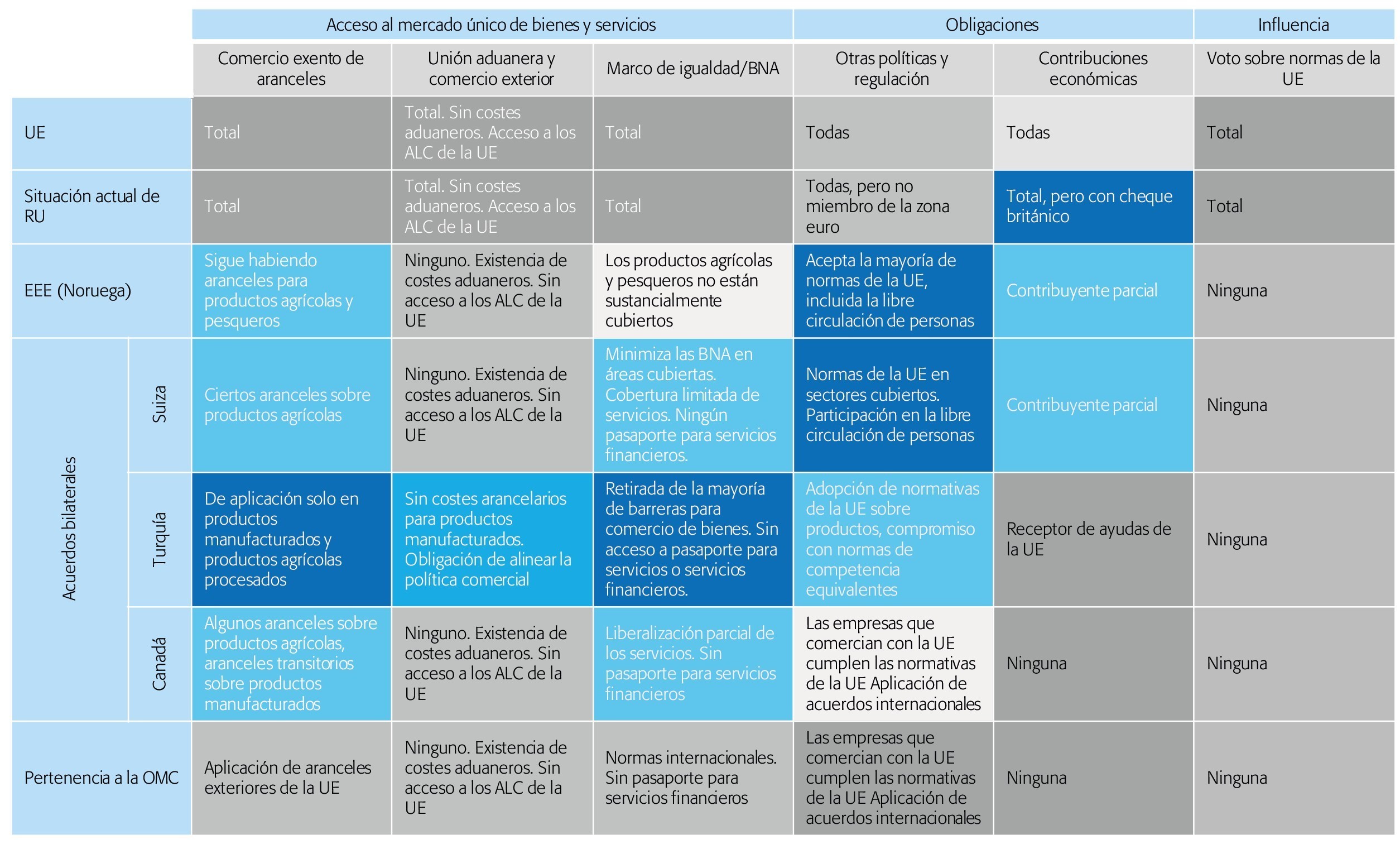 La opción más similar por la que se decanta el Gobierno británico es Canadá, que acaba de firmar un acuerdo de libre comercio con la UE. El Reino Unido sale de la UE, se reinstauran las aduanas y se negocia un nuevo tratado comercial, quedando los británicos al margen de la legislación comunitaria, recuperando así el control total de sus fronteras, su autonomía regulatoria y su plena capacidad para firmar tratados con terceros países.
