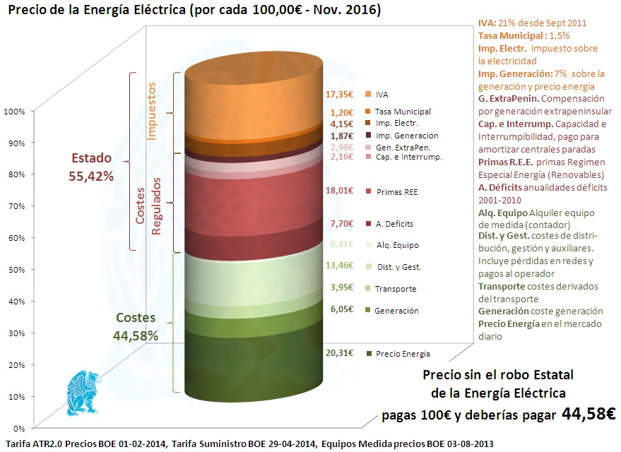 Sin embargo, el mercado mayorista, es decir, lo que cuesta producir la electricidad, tan sólo representa una parte de la factura. En concreto, el precio mayorista de la electricidad, conocido como pool, tiene un peso cercano al 35% sobre el recibo final, mientras que alrededor del 40% corresponde a los peajes (donde se incluyen primas a las renovables, subvenciones o el pago del déficit de tarifa, entre otros costes ajenos al sistema) y cerca del 25% restante al IVA y al Impuesto de Electricidad. Es decir, el 65% del recibo de la luz son costes políticos (en el siguiente gráfico se detallan las principales partidas).