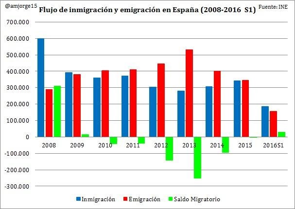 En los primeros años de crisis, el deterioro del saldo migratorio se debe, en mayor medida, al hundimiento de la inmigración procedente del exterior, mientras que en los años de repunte del saldo migratorio ha ejercido un mayor peso positivo la reducción de la emigración. En el primer semestre de 2016, por fin de volvió a alcanzar un dato positivo, el primero desde 2009, aunque haya que tomar con prudencia estos cifras, puesto que todavía son provisionales.