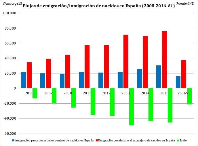 En contraposición al caso anterior, donde el saldo mejoraba por una menor emigración, en este caso ésta ha alcanzado un máximo en 2015 con más de 75.000 emigrantes nacidos en España. Visto esto es evidente que el saldo migratorio difícilmente podría mejorar, sino que más bien tendería a deteriorarse con la recuperación, pero el aumento significativo del regreso de españoles procedente del exterior se ha mantenido estable el saldo en torno a -40.000.