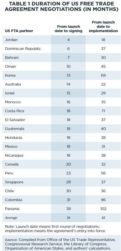 El Instituto Peterson ha analizado una veintena de acuerdos bilaterales existentes entre EEUU y terceros países y el tiempo medio de negociación es de 1,5 años y más de 3,5 años para que entren en vigor. Además, más de la mitad de estos tratados se firmaron en año electoral en EEUU, por ser éste un período más propenso para culminar la negociación ante el posible cambio de Gobierno.