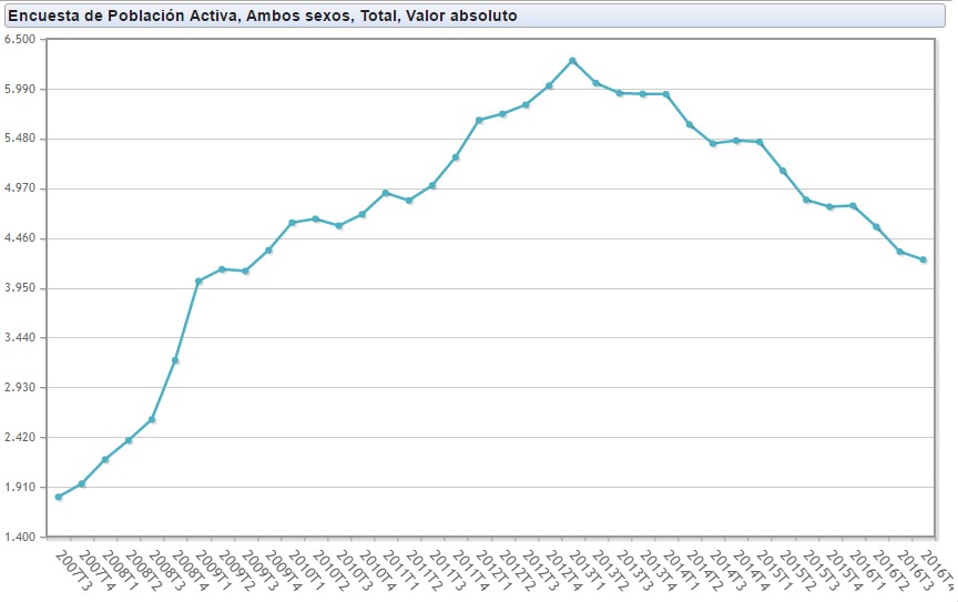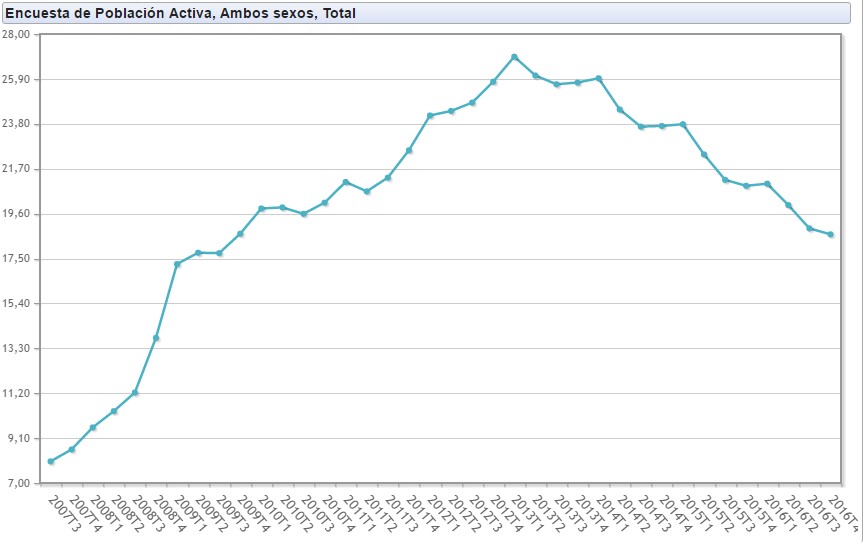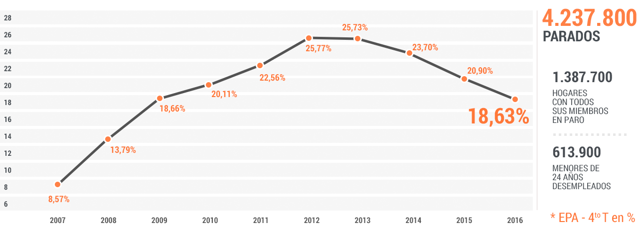 Con 2016, el paro encadena ya cuatro ejercicios consecutivos de bajadas, tras los seis años previos de incrementos. En concreto, el número de parados subió de 1,8 millones en el tercer trimestre de 2007 a un récord histórico de 6,3 millones en el primero de 2013, sumando así cerca de 4,5 millones de desempleados.