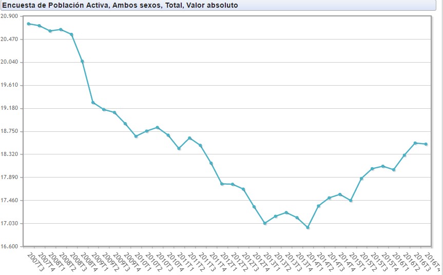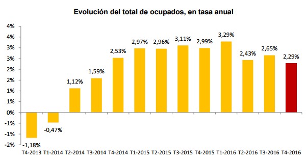 En 2016, España creó empleo por tercer año consecutivo tras seis años destruyéndolo. La economía nacional contaba con un total de 20,7 millones de ocupados en el tercer trimestre de 2007, pero el pinchazo de la burbuja destruyó 3,8 millones de puestos de trabajo hasta el primer trimestre de 2014, cuando el empleo bajó a un total de 16,9 millones.