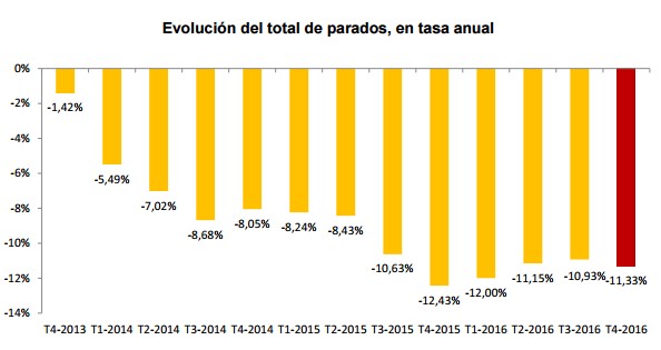 En general, 2016 fue un muy buen ejercicio en materia laboral. Por un lado, el número de parados bajó en 541.700 personas, lo que supone una caída del 11,3% interanual, registrando así su cuarto descenso anual consecutivo y una de las mayores caídas de la serie histórica. En 2015, el paro registró la mayor caída de la serie histórica, con 678.200 desempleados menos.