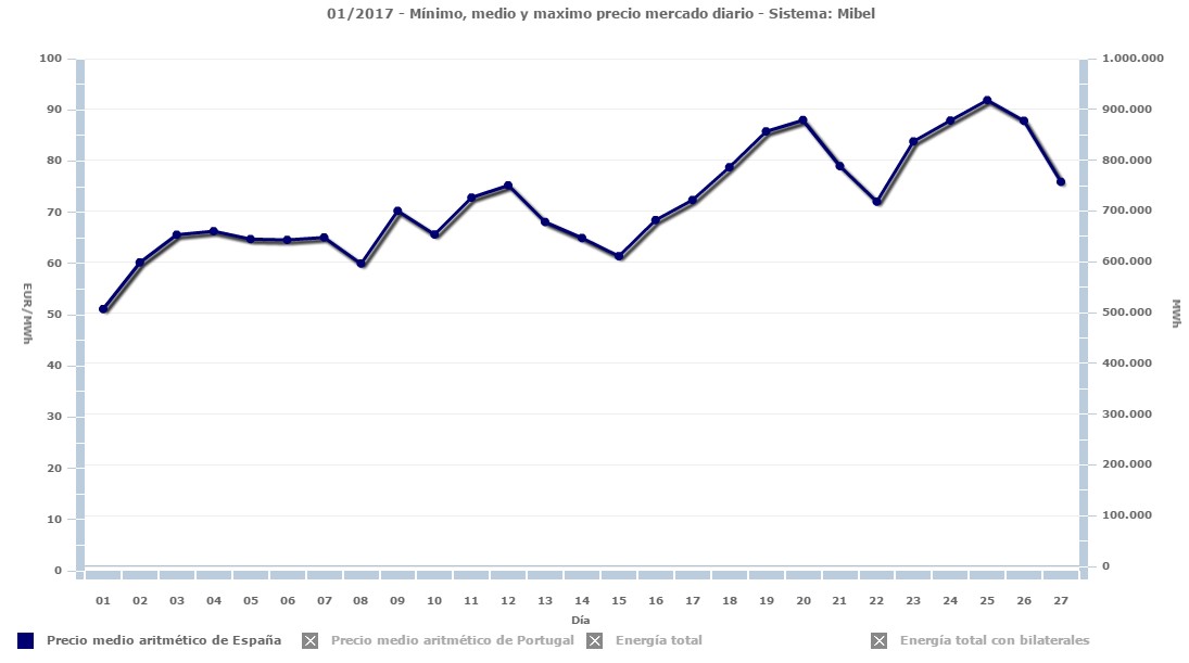 Estas subidas de precios se vienen repitiendo a lo largo de todo el mes de enero. Así, desde el día 1, el precio medio de la electricidad en el mercado mayorista (que representa sólo el 35% de la factura final) se ha encarecido un 72%.