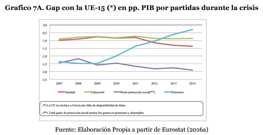 Pero, de nuevo, se trata de una media verdad. El "gasto social" ha subido, sí, pero no por obra y gracia del Gobierno, sino fruto del envejecimiento poblacional, ya que dicho incremento se debe, sobre todo, al creciente gasto en pensiones: cada vez hay más jubilados y cobran una prestación mayor. Así, mientras que el gasto en Educación no varía y el de Sanidad apenas bajó (el gráfico muestra su evolución hasta 2014), el volumen destinado a las pensiones no ha dejado de crecer.