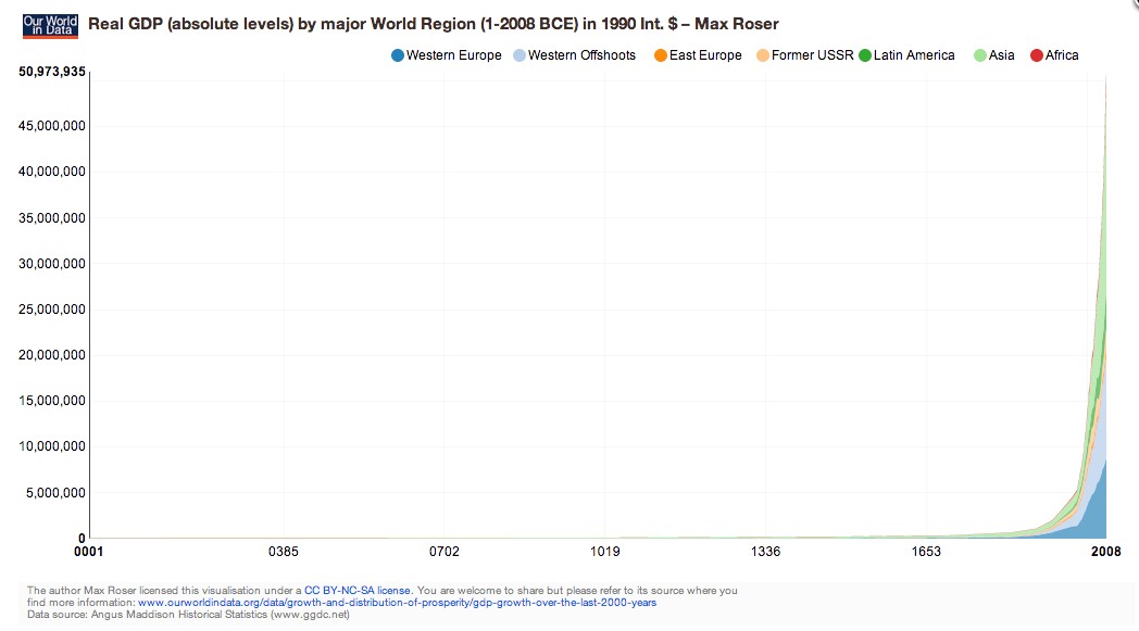 Por último, el mundo nunca ha sido tan rico como hoy. El PIB global se ha disparado en los últimos dos siglos. Desde los tiempos de Jesucristo hasta el siglo XI, el tamaño de la economía mundial apenas experimentó crecimiento alguno. Y algo similar nos encontramos en los ochocientos años siguientes, pero, a partir de 1800, con el nacimiento y la expansión del capitalismo, el mundo experimentó la época de mayor crecimiento y prosperidad de la historia del hombre.