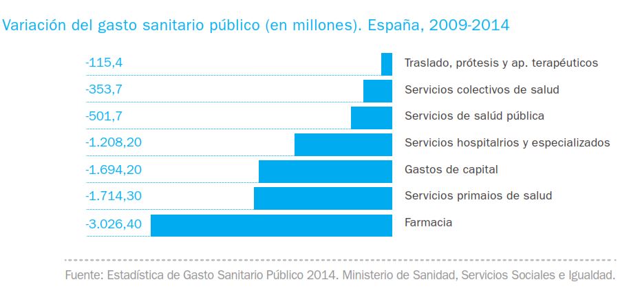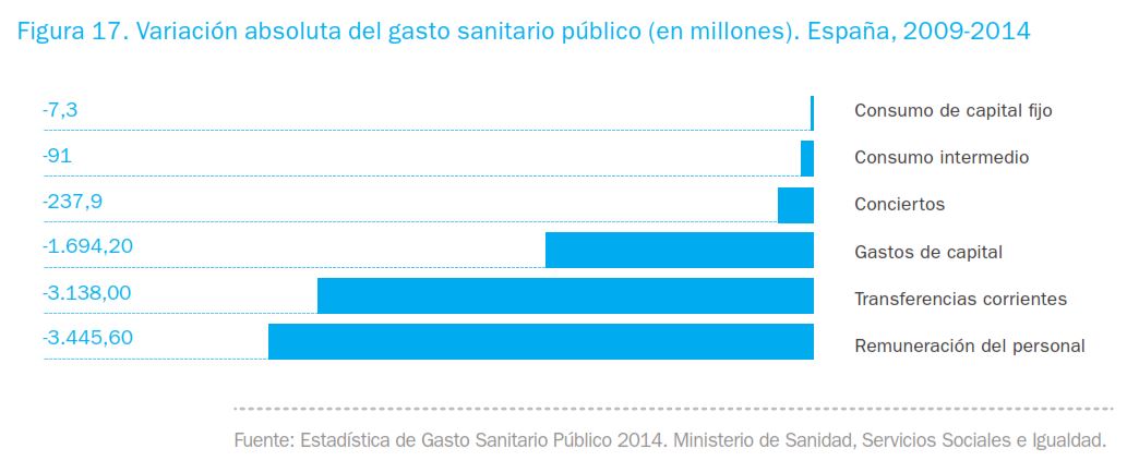 - 8.900 millones: es la reducción del gasto público en Sanidad entre 2009 y 2013. Es un 12% respecto a la cifra del primer año, una disminución muy importante. Pero aquí tan relevante es el dato total como el desglose. En los dos siguientes cuadros se muestran el detalle por partidas (según dos clasificaciones diferentes). Puede verse que fueron el gasto farmacéutico (copagos, genéricos, nuevos sistemas de compras…) y los gastos de personal (congelación de sueldos de los funcionarios y menos contrataciones) los que más sufrieron. También en el gasto en infraestructuras se notó la crisis. Ésta es la opinión de los autores del informe: