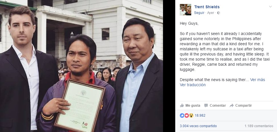 Como cada día, Reggie Cabututan, un taxista filipino de 30 años, subió a su coche para empezar la jornada de trabajo, pero lo que no sabía es que ese día sería especial. Su cliente, Trent Shields, se dirigía a la oficina de coworking ‘Calle Uno’, ubicada en la ciudad de Baguio. Las prisas le hicieron olvidar en la parte trasera del coche su maleta con todas sus pertenencias: pasaporte, Macbook Pro, unos cascos de alta gama… Varias cosas que, en conjunto, alcanzaban un valor de unos 5.000 euros.